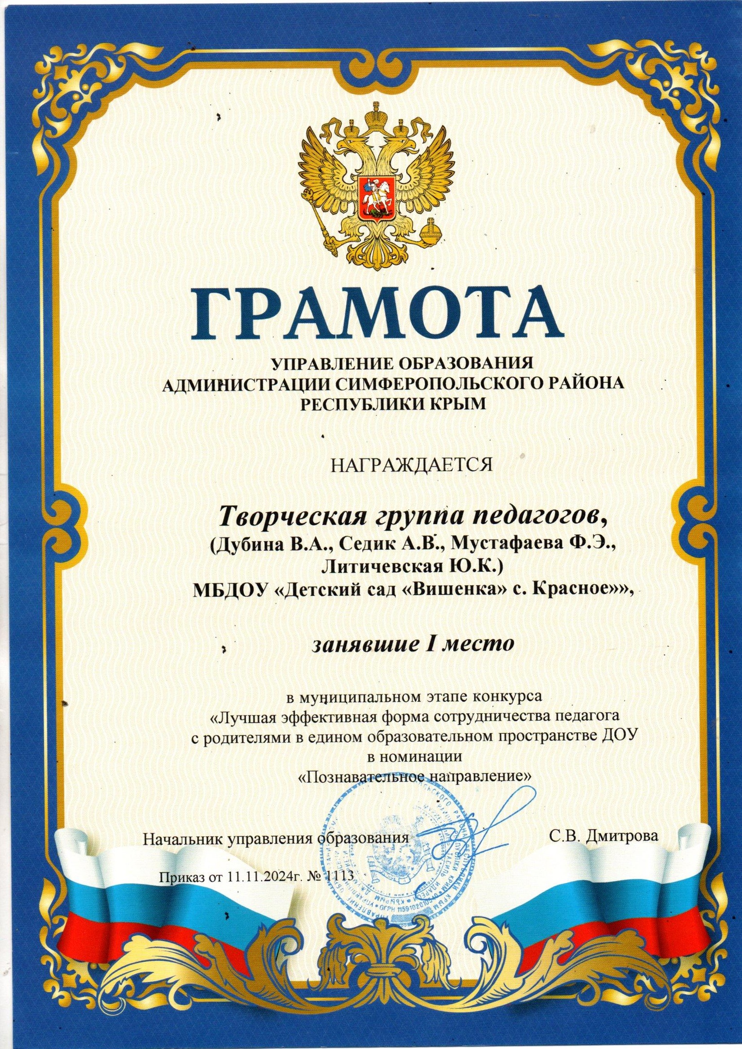 23.12.2024г. наши специалисты детского сада ( Дубина В.А., Седик А.В., Мустафаева Ф.Э., Литичевская Ю.К.) стали победителями в престижном муниципальном конкурсе "Лучшая эффективная форма сотрудничества педагога с родителями". Это мероприятие собрало лучшие образовательные учреждения, и нашей команде удалось продемонстрировать высокие результаты в организации взаимодействия с родителями. Ключевыми аспектами нашего успеха стали: