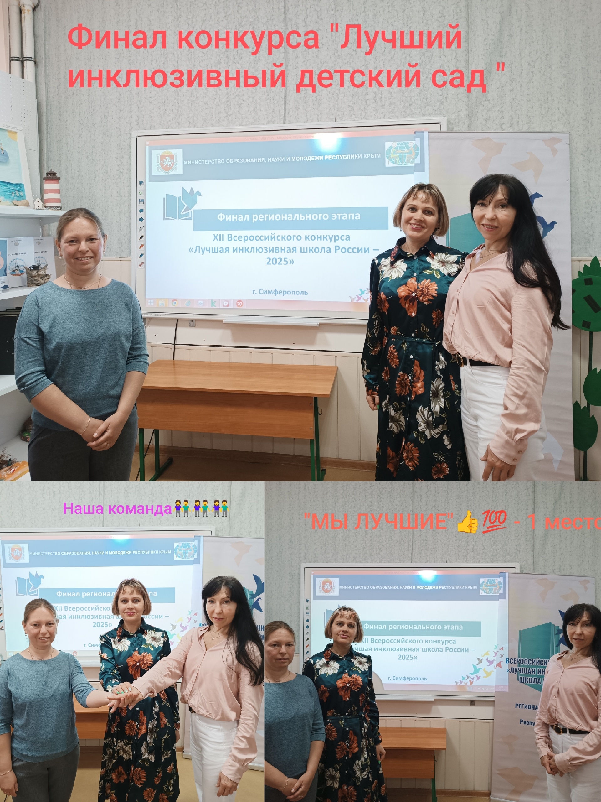13.05.2025 г. С гордостью сообщаем, что команда инклюзивного сопровождения нашего детского сада заняла 1 место в региональном этапе конкурса "Лучшая инклюзивная школа" в номинации "Лучший инклюзивный детский сад - 2025"! Этот успех стал результатом совместной работы всей команды в состав которой входят : Дубина В. А. Седик А. В., Мустафаева Ф. Э., Литичевская Ю. М., Заскокина Ю. М., Тимченко В. П. , направленной на создание комфортной и поддерживающей среды для детей с различными потребностями. Мы гордимся тем, что наше образовательное учреждение активно развивает инклюзивные практики и обеспечивает равные возможности для всех детей.