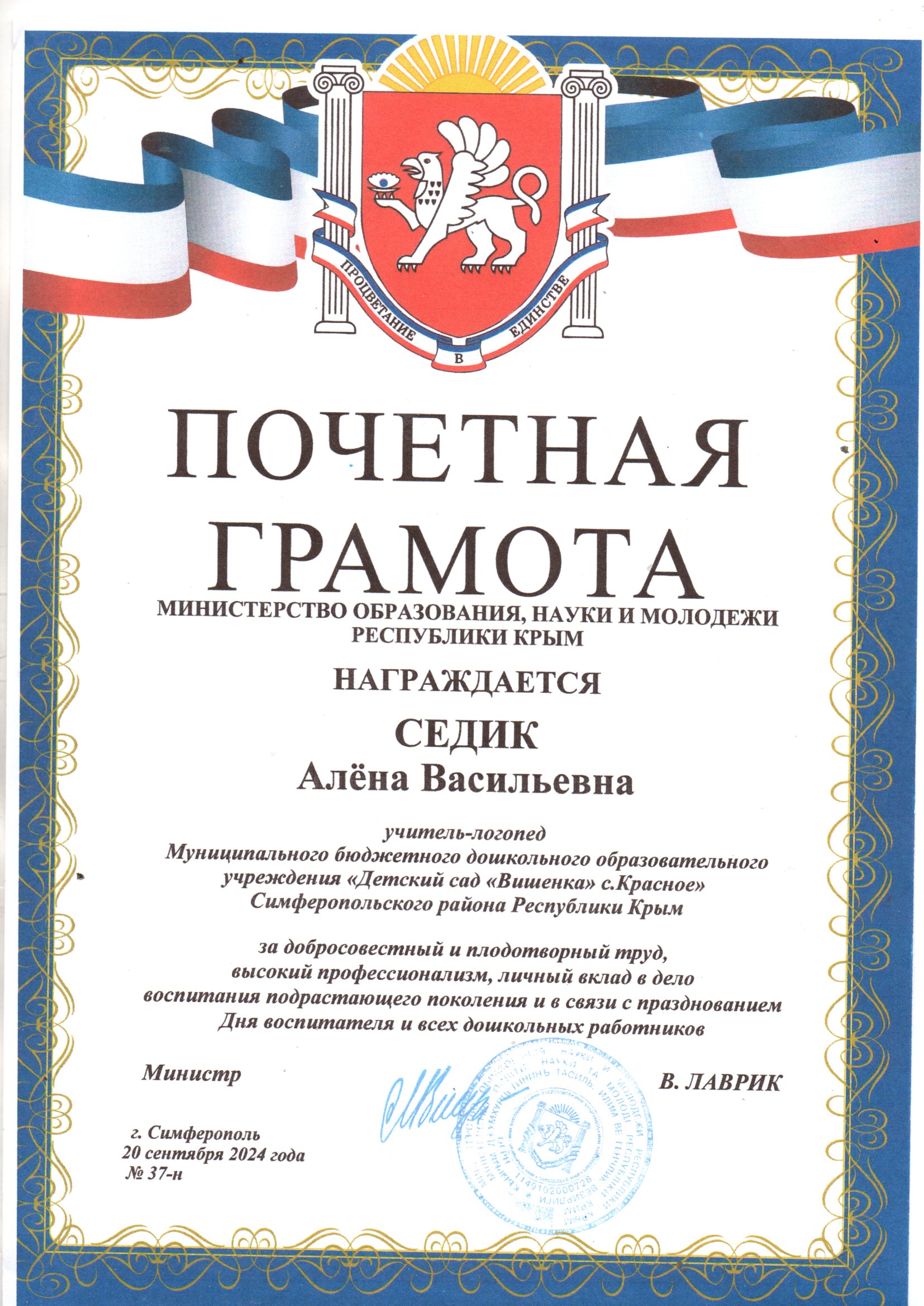 Седик Алена Васильевна награждена Почётной грамотой Министерства образования РК ! Поздравляем с этой заслуженной наградой, которая является прямым подтверждением ваших высоких личностных и профессиональных качеств.
