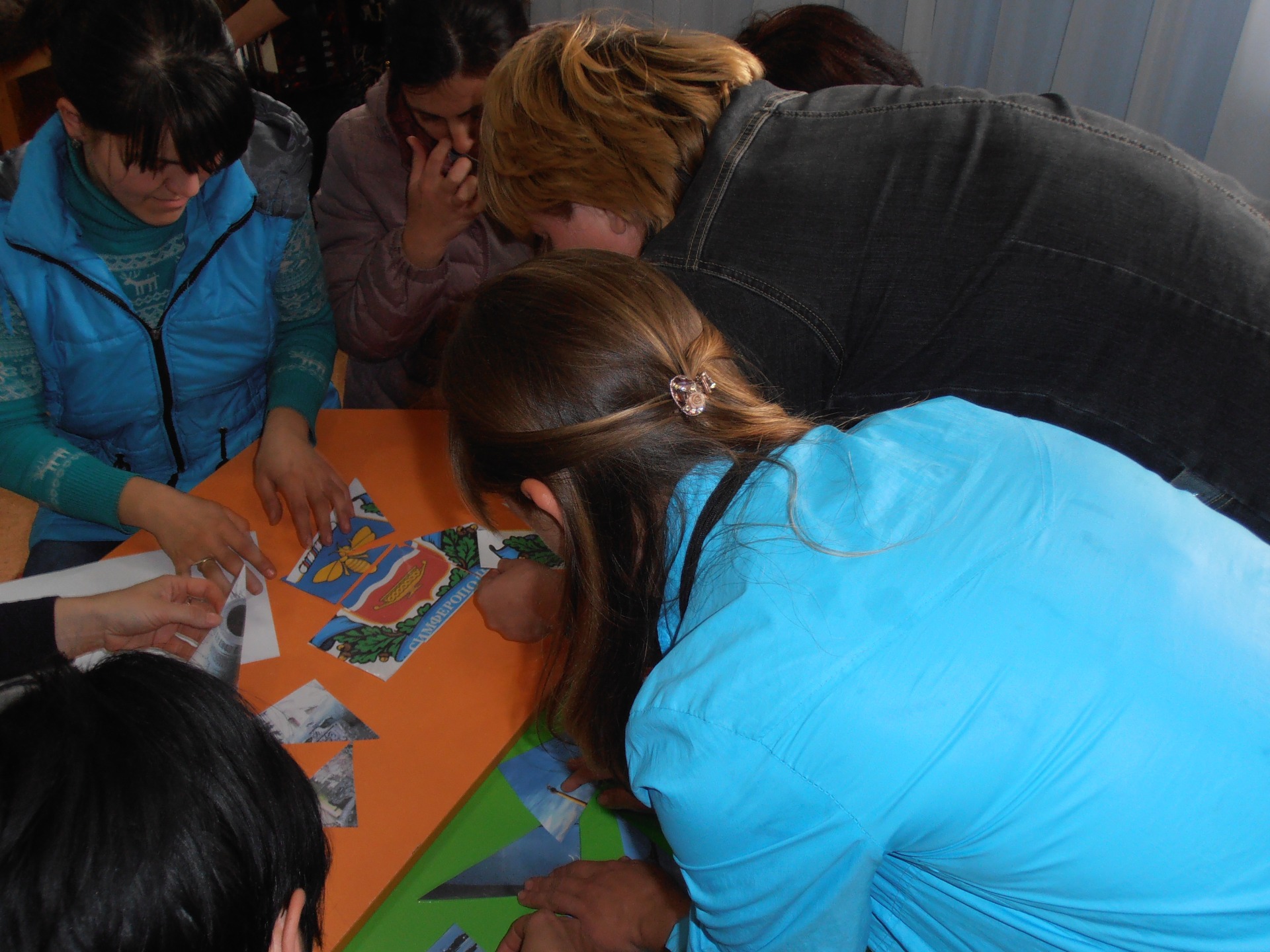 Мультимедийное оборудование, фотографии с. Красное, дидактическая игра «Собери картинку», фонограмма «Звуки природы», ватман, клей, фотографии с видами села, кисти, салфетки на каждого ребёнка.