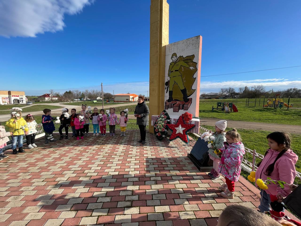 Затем совместно с детьми младшей группы мы возложили цветы к памятнику защитникам нашей Родины.