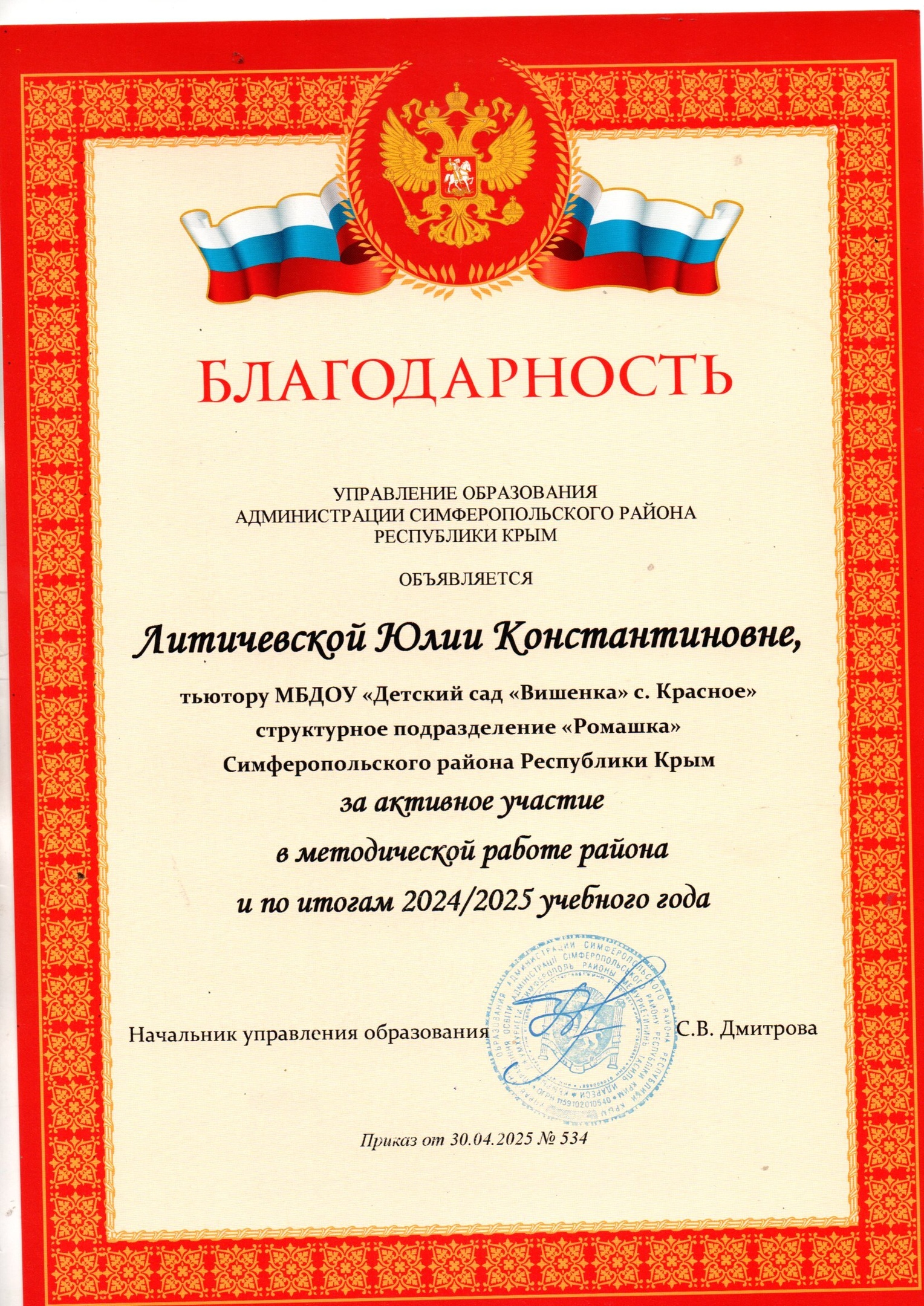 В рамках подведения итогов 2024/2025 учебного года наши специалисты были отмечены за активное участие в методической работе Симферопольского района.