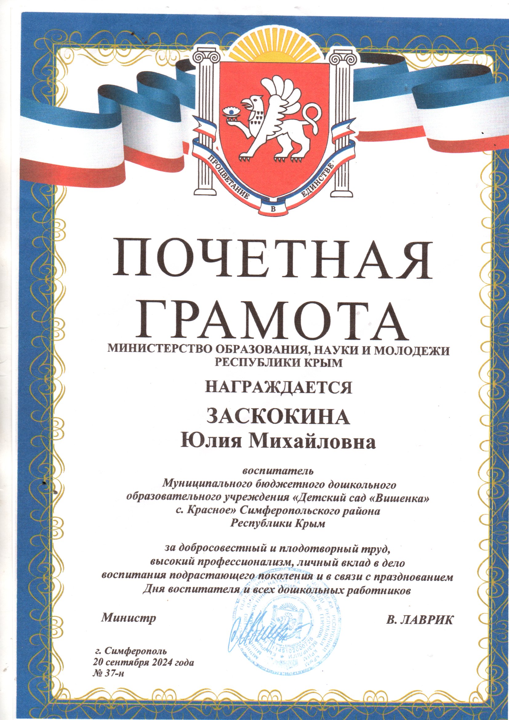 Заскокина Юлия Михайловна в 2024 году награждена Почетной грамотой Министерства образования, науки и молодежи Республики Крым.