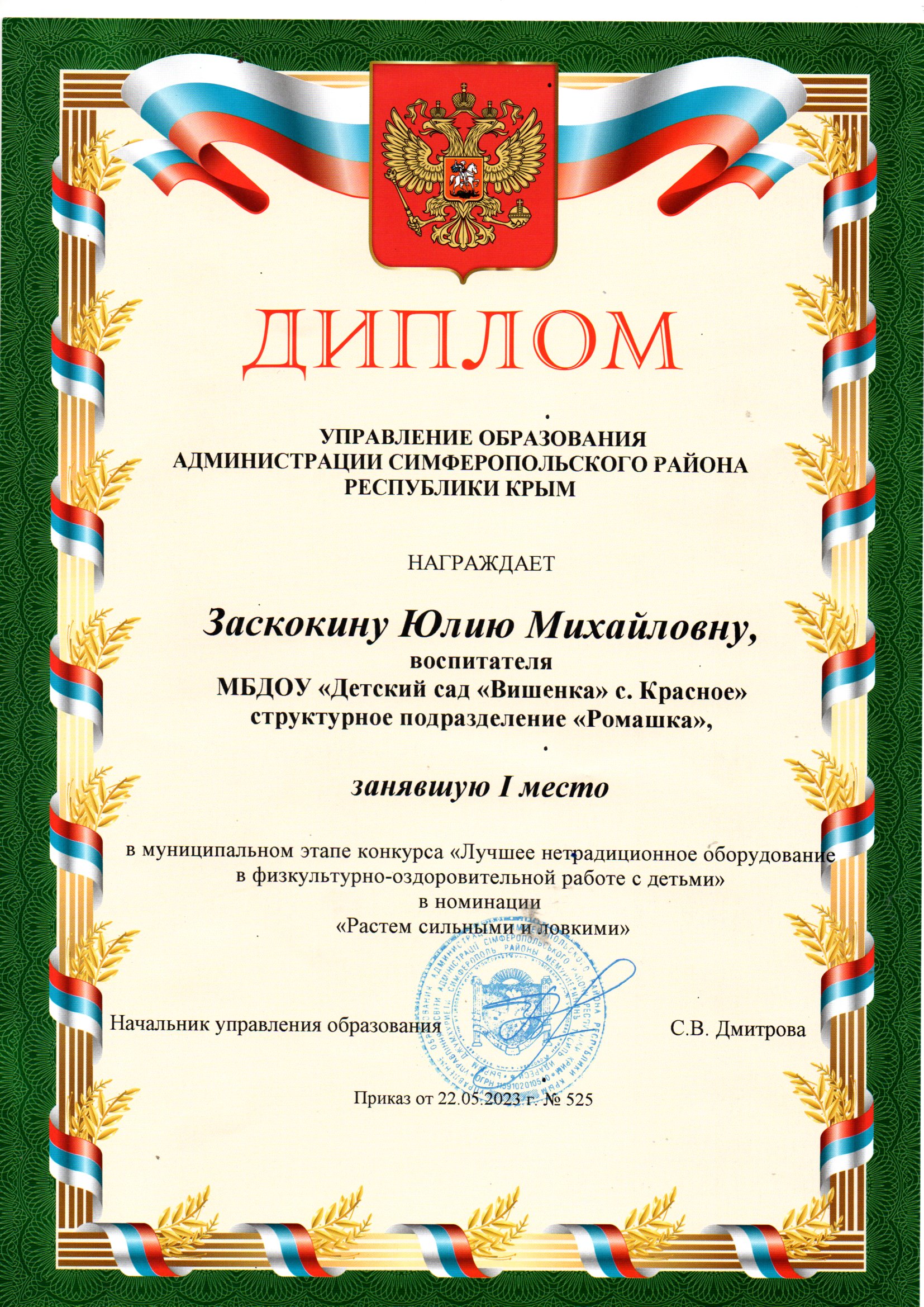 Юлия Михайловна - победитель муниципального конкурса «Лучшее нетрадиционное оборудование в физкультурно-оздоровительной работе с детьми» в ДОУ Симферопольского района в 2022-2023 учебном году.